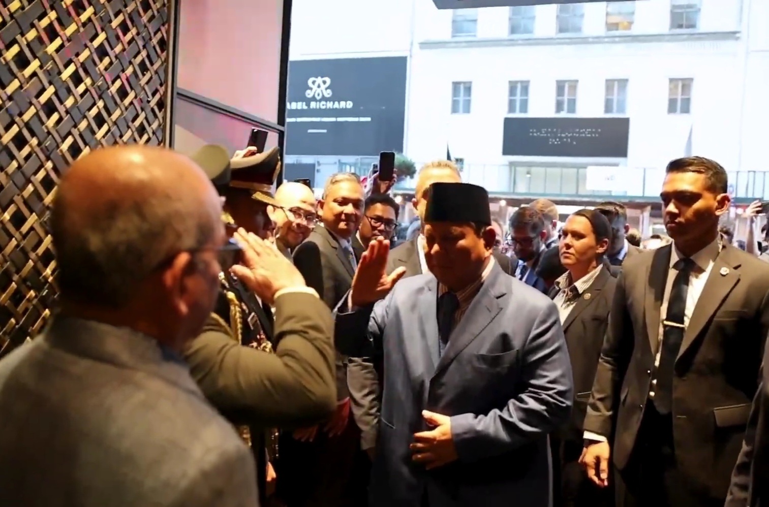 Ratusan warga Indonesia berjajar di sepanjang jalan hotel, menyambut Kepala Negara dengan sorakan “Indonesia… Indonesia… Indonesia!” dan tepuk tangan meriah. Dua anak diaspora, mengenakan pakaian adat nusantara, menyerahkan karangan bunga kepada Presiden Prabowo yang menerima dengan hangat.