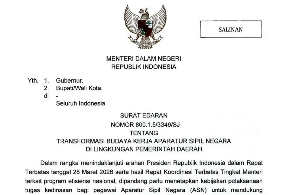 JAKARTA — Pemerintah mulai menerapkan langkah strategis dalam membangun budaya kerja baru yang lebih efisien dan adaptif terhadap perkembangan digital. Melalui Surat Edaran Menteri Dalam Negeri (SE Mendagri) Nomor 800.1.5/3349/SJ, Menteri Dalam Negeri Tito Karnavian menetapkan ketentuan mengenai transformasi budaya kerja bagi Aparatur Sipil Negara (ASN) di lingkungan pemerintah daerah. Aturan ini diberlakukan mulai 1 April 2026.